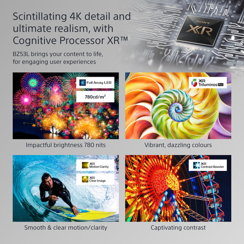 High refresh rate 98” BZ53L sports a 4K 120Hz panel, teamed with XR Motion Clarity and Motionflow XR to express fast paced on-screen movement with unprecedented smoothness, clarity and realism.