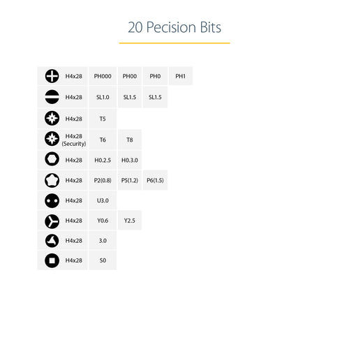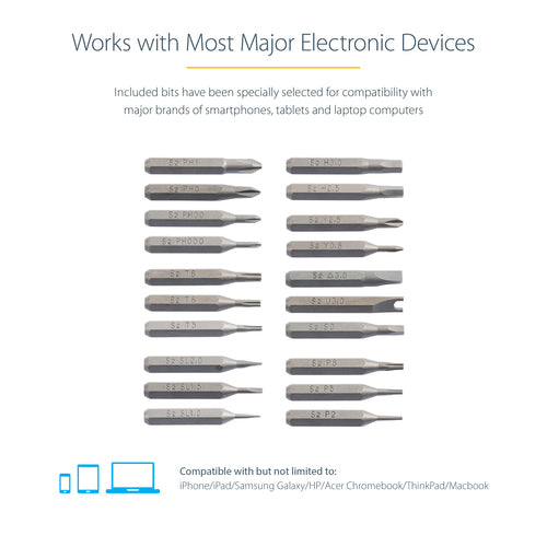 | Screwdrivers/bits tips included | Pentalobe, Phillips, Robertson, Slot, Spanner, Torx, Tri-Wing, Triangle |