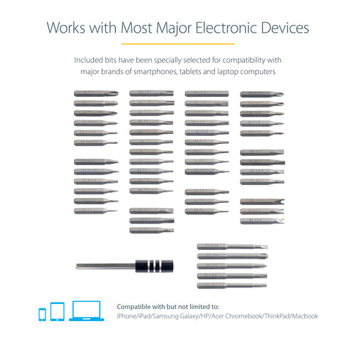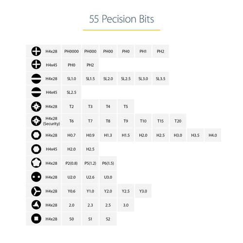 This kit features 55x4mm bits specially selected for extensive compatibility with major brands of smartphones, tablets and laptop computers. Bits Included: