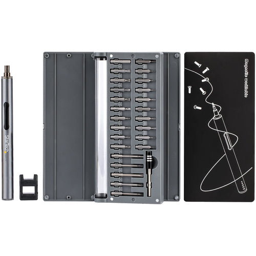 This cord-less screwdriver is the ideal tool to dismantle and reassemble electronic devices during repairs. The battery powered driver set includes a precision electric screwdriver (2 x AAA batteries included), 55 micro bits, a magnetizer/demagnetizer and a magnetic work pad, housed in a durable hard case. A complete range of bits ensures compatibility with most major brands of smartphones, tablets and laptops including but not limited to Apple iPhones, iPads, Macbooks, Samsung Galaxy, HP and Acer Chromebooks, Lenovo ThinkPads.