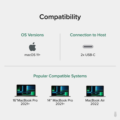 Compatibility 2021 14" M1 MacBook Pro 2021 16" M1 MacBook Pro 2022 M2 MacBook Air 2023 14" M2 MacBook Pro 2023 16" M2 MacBook Pro 2023 14" M3 MacBook Pro 2023 16" M3 MacBook Pro