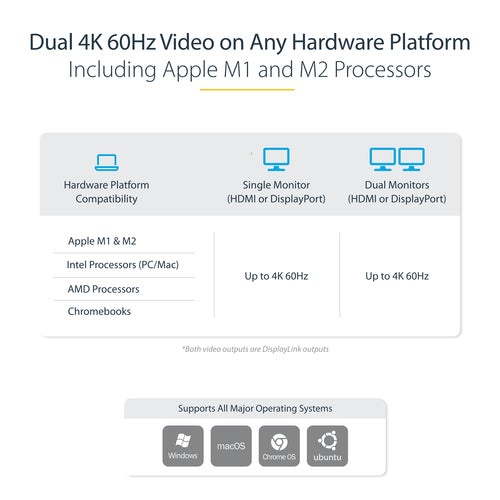 | Chipset | DisplayLink - DL6950, Genesys Logic - GL3523, Fresco Logic - FL7102, Fresco Logic - FL7201, VIA Labs - VL160, RealTek - RTL8153, Texas Instruments - TS3A225E |